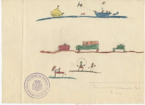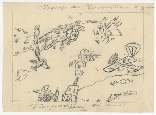 Entre las colecciones y archivos de la universidad de California de San Diego se esconde una pequeña joya. Decenas de estremecedores dibujos, tomados de cuadernos y libretas de niños y niñas españolas entre 1936 y 1938, que muestran descarnadas escenas de guerra y vileza en su más puro esplendor, retratos de muerte y destrucción imborrables. Las tiene clasificadas como «arte y guerra» y ciertamente lo son. Bombardeos sobre población civil, pueblos arrasados, tiroteos y la entrada de tropas fascistas a ciudades vistos a través de los ojos de un niño en zona republicana, que traduce lo que ve y padece como el horror máximo: calaveras, fuegos, humo, aviones que se desploman, vecinos que yacen asesinados en el suelo, mujeres que corren junto a sus pequeños para lograr refugio.