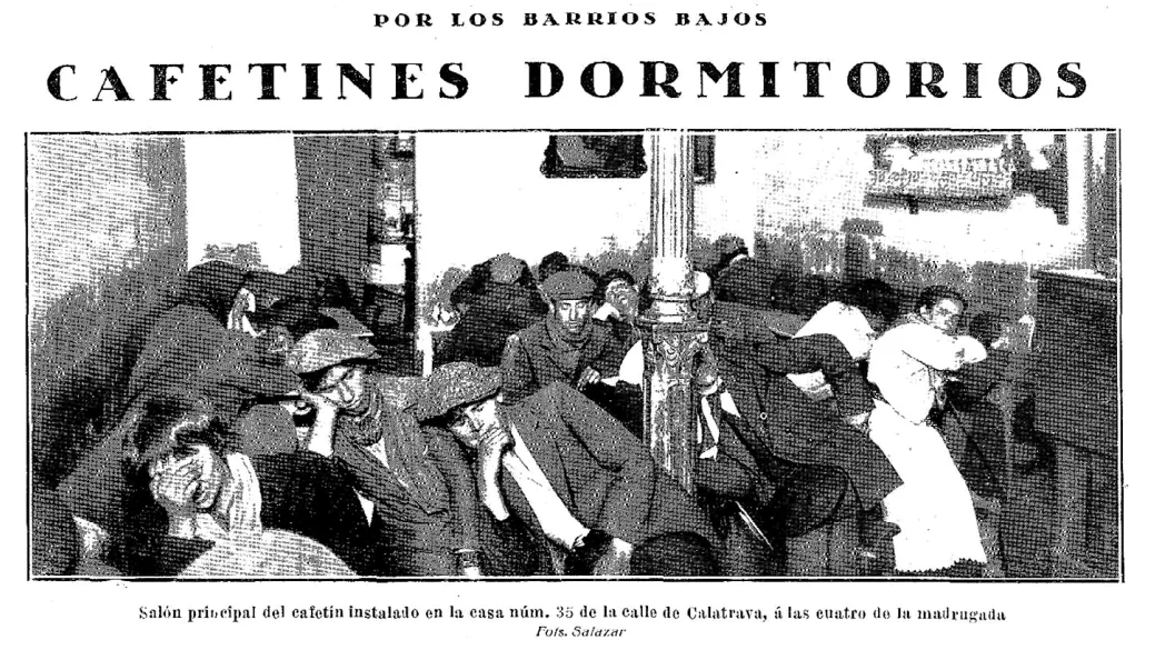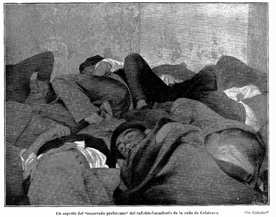 /El periodista, que se hacía llamar «Detective Ros Koff», era en realidad Joaquín Verdugo Landi, pero en aquella España de principios del siglo que había perdido sus colonias, sumida en la miseria y la protesta, en la que pululaban ejércitos de mendigos y pilluelos, junto a lujos obscenos, muchos escritores adoptaban nombres enigmáticos para infundir misterio y peligro. Sus crónicas, como esta misma (publicada en Nuevo Mundo en mayo de 1916), muestran eso mismo, el lado oscuro de la vida nacional. Y, en aquella ocasión, cuando dio la medianoche, se encaminó hacia uno de los locales de peor fama, los llamados «cafetines de dormir». Pertenecían al escalafón más bajo de la noche, lugares oscuros y sórdidos en los que el proletariado, los mendigos y no pocos apaches pasaban la noche como fuese y por unos pocos reales. Ros Koff, quizás por temor o para darle más emoción a su relato, no fue solo, sino que lo acompañó un inspector de policía y dos guardias de seguridad, todos de paisano. Fueron hasta el número 35 de la calle de Calatrava, junto a la calle Toledo, y entraron en aquel «cafetín que sirve a la vez de dormitorio a mendigos, golfos y toda clase de gente maleante y es, como Domínguez [el policía] me había asegurado, digno de estudio y debía serlo también de una inspección sanitaria por parte de nuestras autoridades».