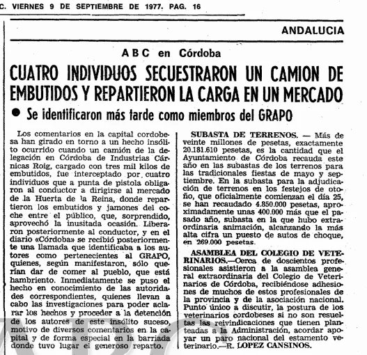/«Solo queremos darle de comer al pueblo, que está hambriento», fue lo que le dijo al asustado conductor uno de los cuatro jóvenes que, a cara descubierta y visiblemente armados, abrieron la puerta de su camión de reparto de embutidos para la empresa Industrias Cárnicas Roig. Eran cerca de las nueve y media de la mañana del jueves 8 de septiembre de 1977 y, al caer la tarde, mediante varias llamadas a diversos medios de comunicación, la acción fue reivindicada por GRAPO (Grupo de Resistencia Antifascista Primero de Octubre).