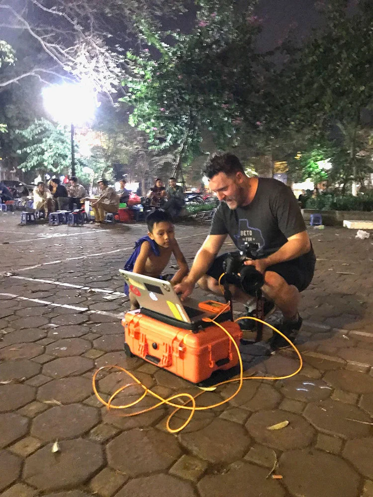 Solamente tenía una semana de trabajo pero no le fue complicado dar con sus modelos. Surcando las laberínticas calles de Hanói, sobre motocicletas muchas veces desvencijadas, los repartidores (de todas las edades y de empresas de todo tipo como Glovo, entre otras) surcaban las calles cargados con enormes paquetes, botellas de agua, alimentos e incluso bolsas con peces, hielo, cartones de huevos. El peso y la carga resultaban increíbles. Enoch, que vive en Londres, quince años antes había viajado por Vietnam. En Hanói quedó fascinado con la gran cantidad de motocicletas y scooters en un tráfico constante y, en ocasiones, abrumador. «Filmamos por la noche —cuenta en su web—, una combinación de querer capturar la luz mixta de la noche y también estar fuera de la logística; es difícil encontrar espacio en el día que no esté ocupado». Las fotografías fueron tomadas en una calle donde montó un pequeño equipo de iluminación y los repartidores se detenían para posar y, posteriormente, seguían su camino.