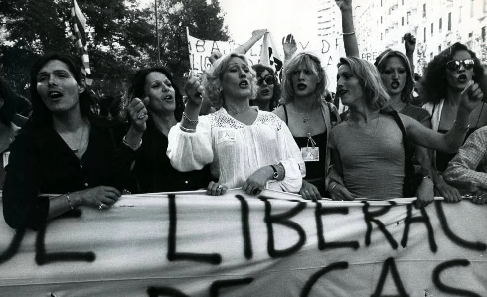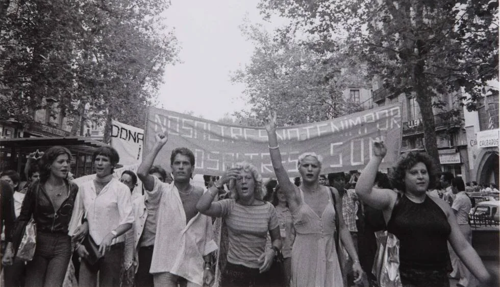 En cuanto los grises se ponen en marcha y sacan las porras, casi toda la manifestación se refugia en calles adyacentes, en parroquias, donde se puede. Excepto las mujeres trans, que se ponen en cabeza y se enfrentan a la policía con todo lo que tienen. Ellas, que sufren en sus propias carnes abusos policiales constantes: palizas, violaciones, robos, acusaciones falsas, asesinatos y desapariciones, deciden que ya no tienen nada más con qué amenazarlas y que el orgullo empieza en aquella Barcelona del 77.
