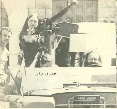 La imagen es como el anticipo de otra, esta vez tomada en el campo de batalla, en la que vemos a una monja en un carro de combate. Está fechada en la primavera de 1975 y la «sierva de Dios» pertenece a la Numur al-Ahrar (Tigers Militia), brazo armado del National Liberal Party (NLP) durante la guerra civil libanesa. Combate, como no, a los palestinos.