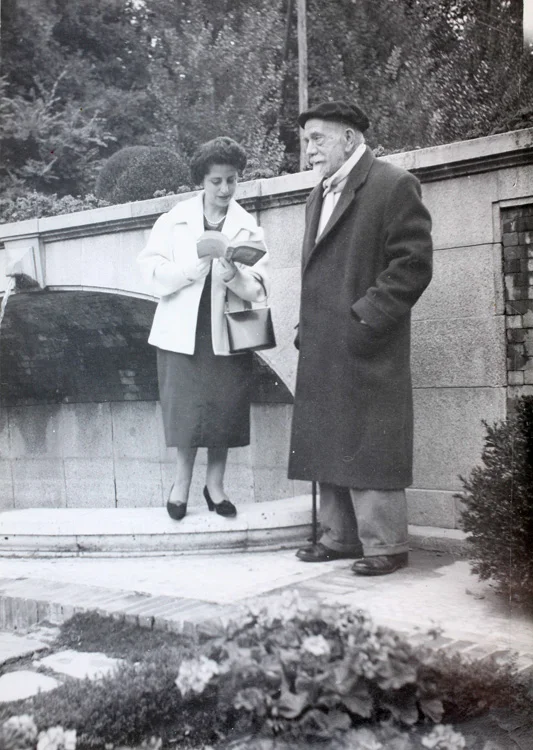 Estas imágenes, que conserva la Biblioteca Nacional, corresponden al último paseo de Pío Baroja en octubre de 1955, un año ante de su muerte, por su querido Retiro y la Cuesta de Moyano, las hileras de casetas de libros de viejo que tanto frecuentó. Los libreros y transeúntes se paran a saludarle y rendirle pleitesía. Hace frío y se halla abrigado con un largo abrigo, bufanda y su inseparable boina, que solamente dejaba de lado, cambiándola por un sombrero, en sus viajes al extranjero. Se sostiene con un bastón. Le acompañan Val y Vera y Palmira Abelló. En una de las fotografías, la más emocionante, esta se haya subida a una fuente y lee un fragmento de uno de sus libros. Pío parece mirar más allá, al infinito, rememorando personajes y lugares. Y sonríe.